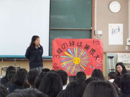 後半は学級委員によって各クラスの学級目標と学級旗の紹介が行われました。今のクラスの課題やめざすクラス像についても発表をしてくれました。みんな、真剣に話を聞くことができました。