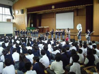 学年目標『POP』について、代表者がポスターを持ち、吹奏楽部(2年生)とコラボして、学年の全員が大合唱を唱えてアピールをしました。P=Positive(積極的な)、O=Only 1(唯一無二の存在)、P=Powerful(力強く)の意味です。そして、学級旗の紹介は、学級委員中心にクラスのアピールをしました。より団結した学年へと成長しています。更なる飛躍を期待します。
