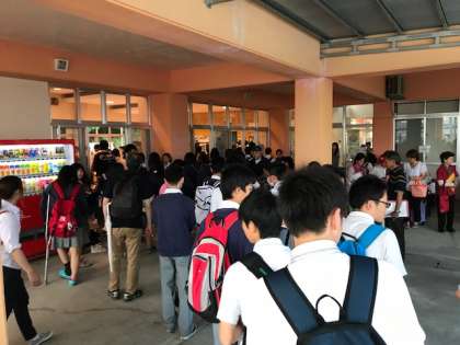 18:35ごろ、古宇利島に到着しました。次は入村式ですが、遅れた分、屋外でなく、公民館で実施となりました。公民館へ移動です。