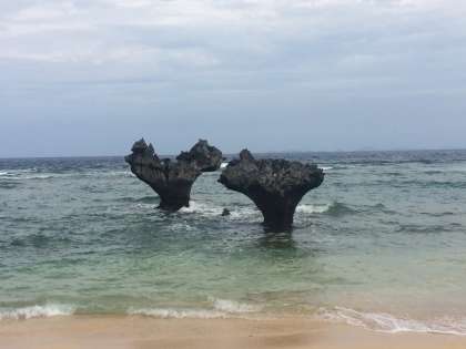 「岩がハートの形に見えるハートロックです。古宇利島では有名な観光地だそうです。海がきれい!」とのことです。