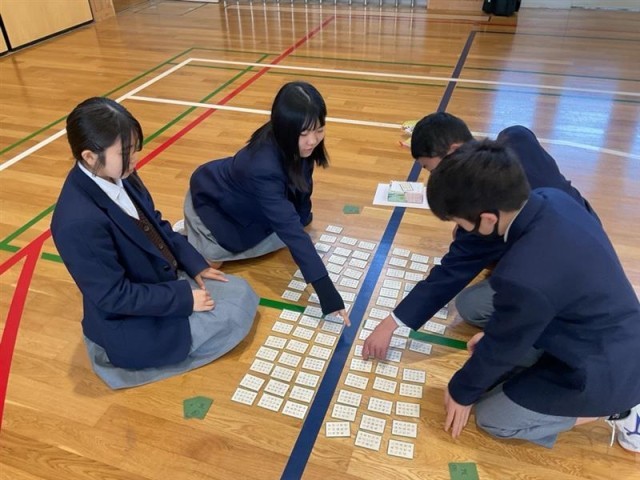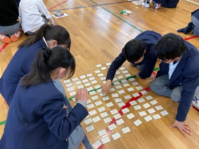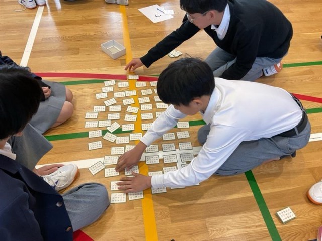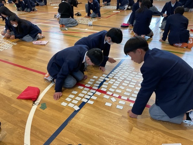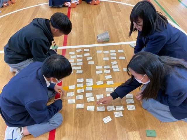 頑張って覚えた成果を発揮する為に1年生の学年で、『百人一首大会』を行いました。学年の先生が、順番に札を読みました。先生たちも歴史的仮名遣いを読むのは、難しかったです。上の句から取れる人もたくさんいました。