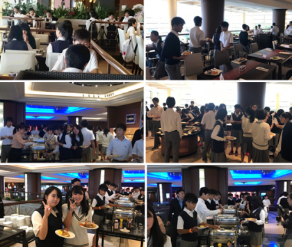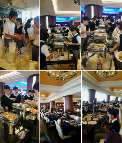 修学旅行3日目になります。全員元気に起床しました。朝食を食べています。この後バスに乗車し,各事業所に向けて出発します。