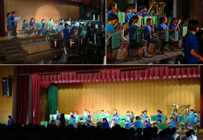 大宅小学校の児童の人たちによる交流の演奏,そして,岩屋太鼓,吹奏楽部の演奏の様子です