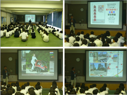 NPO法人自転車活用推進研究会から講師の方をお招きし,自転車のマナー・ルールについてお話ししていただきました。校区内の危険場所や事故の事例を写真で示して頂き,非常に分かりやすい講義でした。普段の生活の中で自転車を使う時には是非,実践をしましょう。