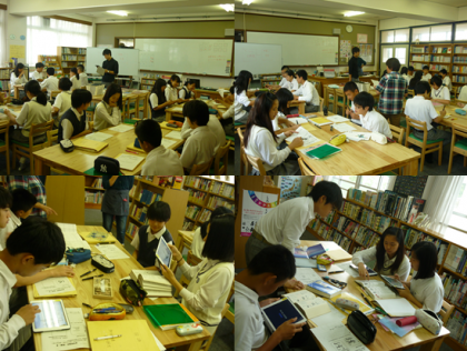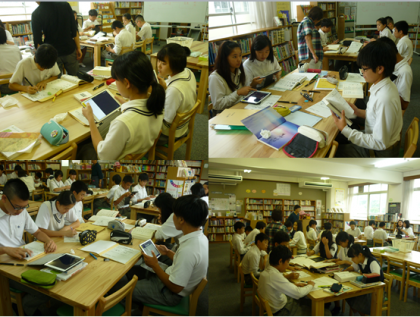 3年生の学校図書館を使った国語の授業です。落ち着いた雰囲気で辞書とタブレットも併用しながら,相談して課題に取り組んでいました。