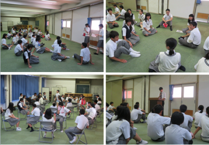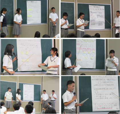 まずは、アイスブレーキングで自己紹介や椅子取りゲームなどで和やかなムードを作りました。そしてグループごとに,学校生活について生徒総会で出たことや卒業生の意見などを参考にして改善策を話し合ったりしました。全体での発表のために,ポスターの製作もしました。最後に,各グループで話し合った内容を発表しました。今後にいかしていける有意義な研修会でした。