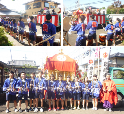 秋晴れのもと,岩屋神社神幸祭で生徒会本部が岩屋太鼓を