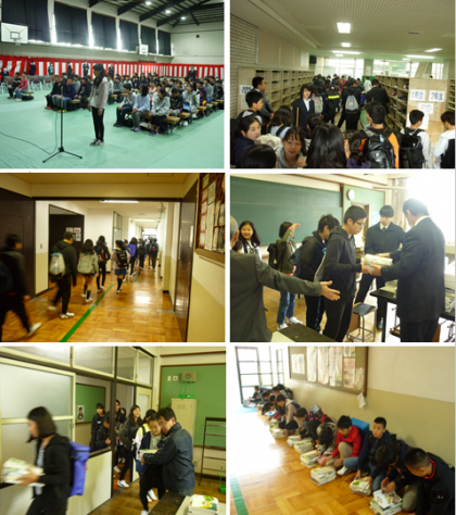 4月8日(月)学活終了後に,体育館の周辺の掃除を1年生,会場設営を2年生が担当して縦鼻をしました。午後からは,新入生が入学式の練習のために前日登校しました。クラス発表を見て整列した後,体育館に入り式の説明を受け,教科書を受け取りました。