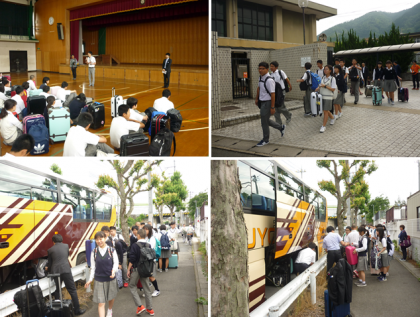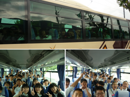 6月11日(火),修学旅行出発の日です。学校に集合して結団式を行いました。同行する旅行業者の方やカメラマンの方の紹介がありました。バスに乗って元気に学校を出発して京都駅に向かっています。