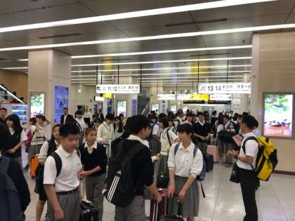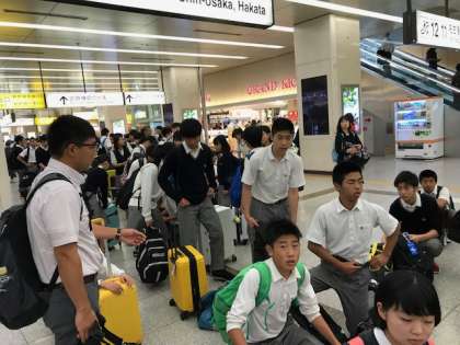 京都駅に到着して,コンコースに集合整列をしています。まもなくホームに移動して,9:26発の新幹線に乗車します。
