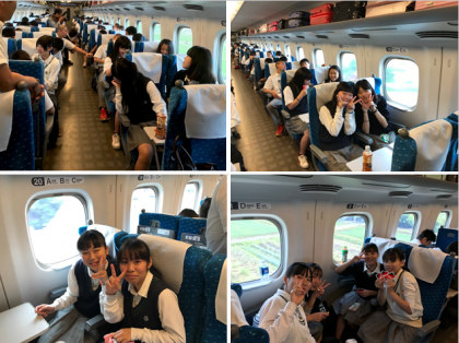 新幹線車内の様子です。全員無事に乗車して,楽しく過ごしています。