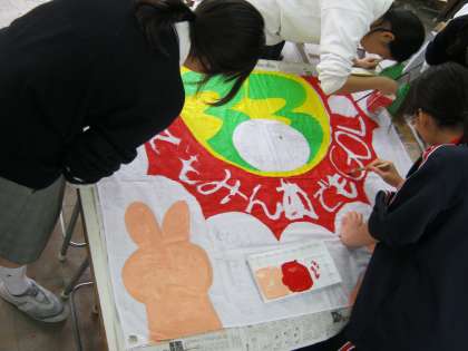 学級目標をモチーフに各学級で募ったデザインはどれもすばらしいものばかりです。文化委員が中心となり、白い布にどんどん筆を入れていきます。