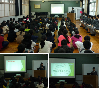 1月23日(木)に生徒会本部の皆さんが大宅小学校を訪問しました。6年生の児童のみなさんに大宅中学校の生徒会活動や学校生活を紹介しました。6年生の人たちは、興味深く説明を聞き、積極的に質問をしてくれていました。中学校入学を心待ちにしているようでした。