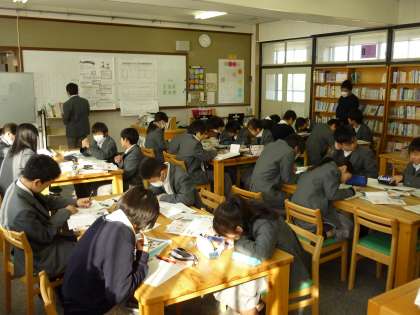 2月5日(火)1限,1年生の学校図書館を使った社会科の授業です。図書館の資料を使って課題に取り組んでいました。