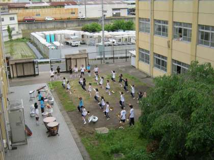 吹奏楽部に所属する約50名の生徒が日々練習に励んでおります。普段は音楽室や普通教室など屋内で活動しているのですが、最近は中庭などの屋外で練習に汗を流しています。と言うのも、6月12日日曜日に、京都会館で開催される「ブラスコンサート2011京都吹奏楽祭」でステージマーチングショーに出場するためにマーチングの練習をしています。とても一生懸命なまなざしで練習に打ち込む姿は本当にすばらしい目をしていました。今後も練習に励んでほしいものです。