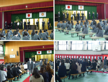 在校生代表の「新入生を迎える言葉」と,新入生代表の「誓いの言葉」の様子です。新入生を迎える言葉では,生徒会長が中学校での授業や部活動,生徒会活動などの紹介を話していました。また,誓いの言葉では,中学校生活をどのようにしたいかなどを話していました。緊張した様子もありましたが,しっかりと話すことができていました!