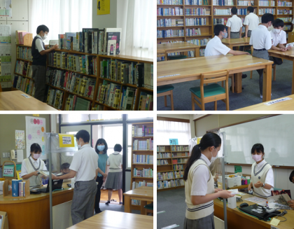 感染症対策で,しばらく昼休みの図書館開館を見合わせていましたが,今日(7月2日)から昼休み中の開館がスタートしました。当面は月曜日と木曜日のみの開館で,多くの生徒が密集するのを防ぐため,学年ごとに利用できる日を決めています。
