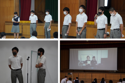 その後,有志の生徒たちによる出し物もありました。吹奏楽部の演奏の動画もありました。今回,学年集会のために,準備を頑張った皆さん,ありがとうございました!