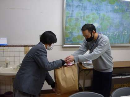 12月10日(木)「いわやの里」の方からぞうきんの寄付をいただきました。学校を代表して美化・保健委員長が受け取り,お礼を言いました。学校の美化のためにぞうきんを大切に使います。ありがとうございました。