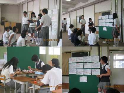リーダー研修会では5つのグループに分かれ、生徒総会で各クラスが提案したアクションプランの中から選んだ企画や、京都市生徒会議に持ち寄る議題などについて討論を行いました。それぞれのメリットやデメリット、よりよく実施するための工夫や修正などを提案し、話し合い、それぞれの企画を深めていました。最後にはポスターセッションの形式を参考に発表を行い、互いのグループの討論への理解も深めました。
