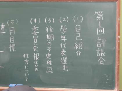 本日後期第一回目の評議会・各種委員会が行われました。先日行われた生徒会本部役員選挙で選ばれた委員長たちにとっては初めての委員会でした。事前に何度も顧問の先生と相談したり、委員長たち同士でアイデアを出し合ったりして、今日の委員会を向かえました。委員会では主に学年代表の選出や後期の予定の確認、委員会報告の仕方についての説明が行われました。