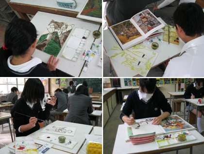 3年生の水曜日1時間目は選択の授業です。前期と後期に分かれており、音楽、美術、体育、技術、家庭の中から1年間で希望する2講座を受講します。音楽はギターやキーボード、木琴、鉄筋、トライアングルなど、さまざまな楽器を手に、発表に向けて演奏の練習をしていました。美術の講座では、生徒にはあまりなじみのない油絵の具を使い、作品を作っていました。技術では、ラッパを吹く人形が動くからくり付きのオルゴールの製作をすべく、木にニスを塗ったり、ねじで部品をとめたりしていました。どの講座も生徒が真剣に取り組んでいます。