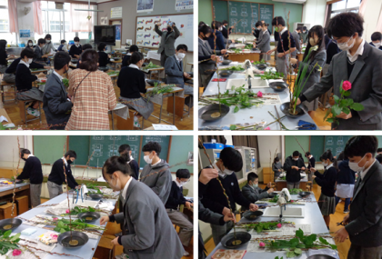 2年生が、11月29日に、いけばな体験をしました。講師の先生として、桑原専慶流の十五世家元の桑原仙渓先生や他の先生方にお越しいただき、2時間いけばなを楽しみました。赤芽柳・レモンリーフ・水仙・薔薇の4種類のお花を、少し緊張しながら丁寧に扱いました。完成品は一人一人の個性や違いがあり、十人十色でした。華道とはお花を生けることで自分の道をみつけていくもの、と言われていました。みんなにとって、とても貴重な経験になりました。