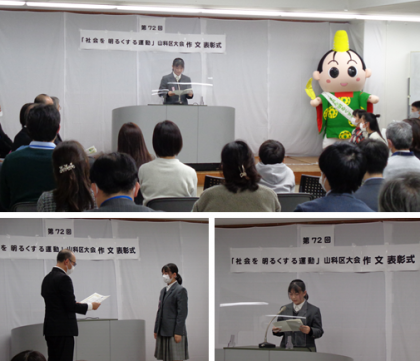 「社会を明るくする運動」山科区大会 作文表彰式が行われました。本校からも作文発表を行い、表彰を受けました。しっかりとした発表をしてくれていました。