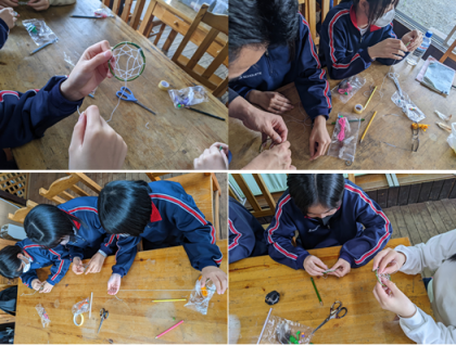 ドリームキャッチャー作りです。糸を編んでいって作っています。難しい!との感想です。