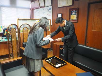 12月8日(金)3年生の生徒が京都府租税教育推進連絡協議会主催の「中学生の税についての作文」で優秀賞を受賞しました。本校校長室で授賞式を行いました。