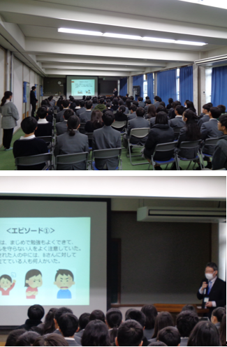3月13日(水)4限 1年生は「どうして いじめが起こってしまうのか」という題で、スクールカウンセラーの先生が講義をしてくださいました。いくつかのケースを提示していただいて、わかりやすく教えてくださいました。皆さんの真剣に聞いていました。