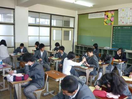 本日1限目、1年生は集会で2・3年生は学活でした。3年生の学活は、自己紹介カードと個人目標を書きました。自己紹介カードは自分の好きなことは勿論のこと、自画像を描く場所や、こんなクラスにしてみたいという項目もありそれぞれの意気込みを書いていました。その後に、今年の生活面・学習面の目標を書きました。