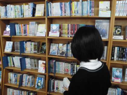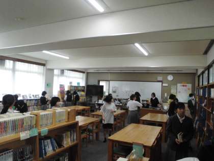 大宅中学校の図書室は、学校図書館司書の熱心な工夫のおかげで、とても楽しく、興味がもてる図書が充実しています。ディスプレイ(本の展示配架)一つをとっても、細やかな心配りがなされていて、皆楽しそうに本を選んでいます。