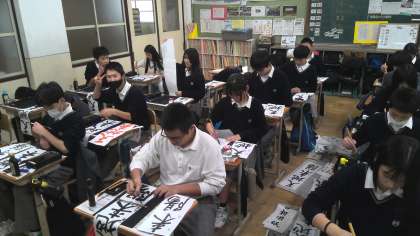 1年生では書初めの授業を行いました。
