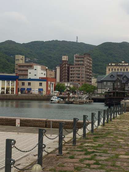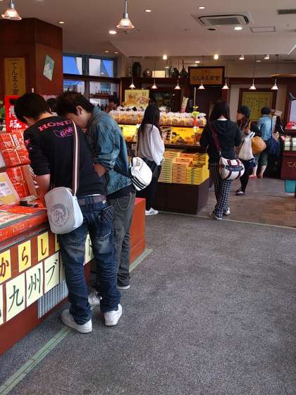 レトロタウンを班別で散策しています。おみやげを買うグループもあります。九州には、おいしい食べ物が多いです。さあ、何を選ぶのでしょうか。