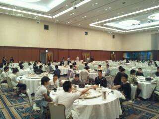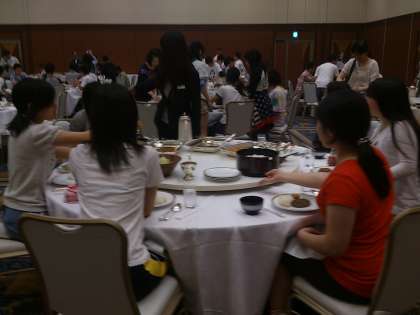 ホテルでの夕食の様子です。みんな、笑顔で食事を楽しんでいます。笑顔で会話するのは、消化にもいいそうですよ。