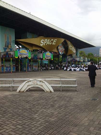 ホテルの隣にある「スペースワールド」に到着しました。昼食をはさんで、午後2時すぎまで滞在します。思う存分楽しんでください。ただ、自分の研究テーマについての学習も忘れないようにね。