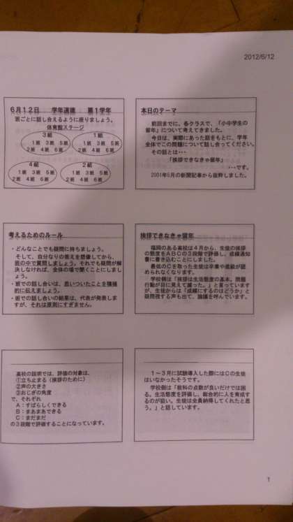 前回までに各クラスで「小中学生の留年」について考え、本日は実際にあった話をもとに学年全体でこの問題について話し合いました。