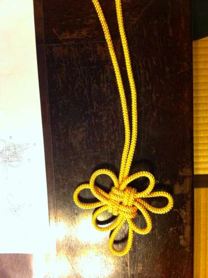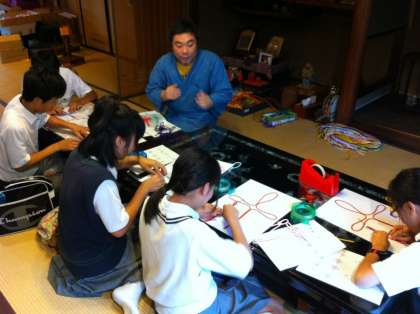 「房ひも」をつくる体験です。「房ひも」は、お守りに使う小さなものからお祭りに使う大きな飾り房まで大小様々です。京都の雅を醸し出すためには、なくてはならないものです。職人さんにていねいに教えていただいて、きれいな「房ひも」が完成しました。