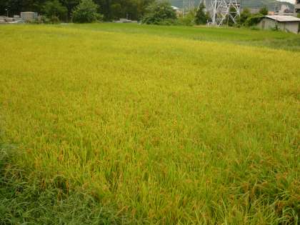 校門前の水田の稲穂は、黄金色に輝いて、頭を垂れています。稲刈りも近いようです。