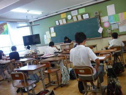今朝は、涼しく、秋の気配でした。「学習の秋」も近しを感じました。文化祭まで、あと一週間ですが授業は集中した雰囲気で進められています。学習の基本は、「毎時間の授業を大切にする」ことです。毎時間の授業で、何か新しいことを一つでもつかみ取ってください。その積み重ねが、知らない間に大きな力になっていきます。写真は、上から1年生理科の授業風景、3年数学の授業風景(分割授業を行っています)、育成学級の授業風景です。