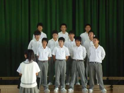 今日は、9月20日(木)午後1時から東部文化会館で行われる合唱コンクールのリハーサルです。クラスで、熱心に練習を続けてどのクラスも上達しています。職員室にもすばらしい歌声が聞こえてくることもあります。本番に向けていよいよラストスパートです。リハーサルでは、入退場の仕方や舞台での並び方の確認をして、選択曲の1番を合唱しました。さあ、どのクラスが最優秀賞に輝くか楽しみです。