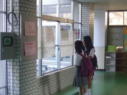 秋晴れのすがすがしい1日です。朝の登校時、校内をまわっていると1年生が、ベル着点検の結果表を興味深く見ていました。現在、ベル着点検実施中。ベル着をしっかりして、時間を有効に使ってください。グランドでは、保健体育の先生が、体育の授業の準備中。体育の授業では、ハンドボールをしています。授業中は、歓声があがることでしょう。また、グランドの奥は、今まで木が生い茂っていて見通しが悪かったり、ボールが入り込むと見つけるのに苦労したのですが、管理用務員さんにきれいに剪定してもらって日当たりも良くなり、ボールも見つけやすくなりました。