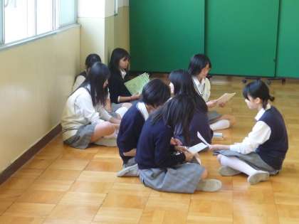 廊下では、吹奏楽部でしょうか。何か打ち合わせをしているようです。