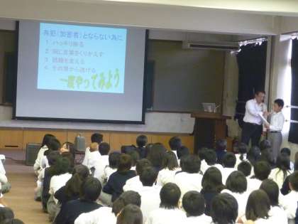 5時間目に1年生の非行防止教室が行われました。講師の先生を迎え、ケイタイ、暴力、いじめ、万引き、薬物などについてお話しをしていただきました。例えば、ケイタイによるメールで思わぬ犯罪に巻き込まれたり、最初はふざけあっていたのが、いつの間にか「いじめ」に発展したりと日常生活で気をつけてほしい事柄をわかりやすく解説していただきました。