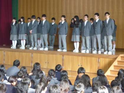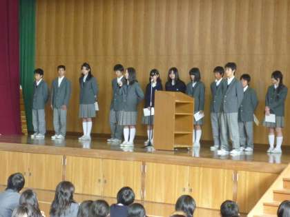 5時間目に新生徒会本部役員と新学級委員の認証式を体育館で行いました。まず、旧第26期生徒会役員の皆さんから新27期生徒会役員の皆さんに認証書が手渡されました。次に旧第26期生徒会の生徒会長が最後の挨拶で全校生徒へさまざまな行事での協力に対しての御礼を述べました。次に第27期新生徒会長が、挨拶に立ち、「巧言令色鮮なし仁」の言葉を引き合いに出し、口先だけでなく誠実に行動していきたいと全校生徒に話しかけました。新学級委員の皆さんにも認証書が手渡されました。