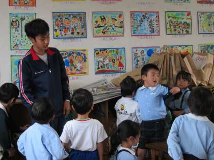 保育園とスーパーマーケットで活動している様子です。スーパーマーケットでは、商品の品出しをしています。保育園では、園児に囲まれて楽しそうです。