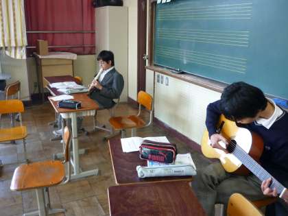 3年生の音楽の授業では、ギターとアルトリコーダーの練習に熱が入っています。最後にギターとアルトリコーダーの合奏をする予定です。心地よいハーモニーを響かせてください。