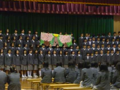 その後、1・2年生からの出し物です。1年生はメッセージと合唱。2年生はパワーポイントを使ってのメッセージと合唱。よもに完成度が高く、聴きごたえがありました。