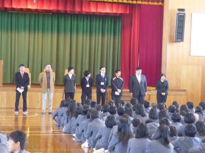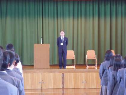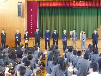 続いて始業式では、校長先生の挨拶があり、「人権感覚」を磨く大切さを話されました。特に、自分とは個性も考え方もちがった他人を認め合うことの必要性を強調されました。また、読書をすることで「考える力や想像する力」を育ててほしいことも話されました。その後、担任・副担任・部活動顧問が発表され、生徒たちから歓声があがっていました。